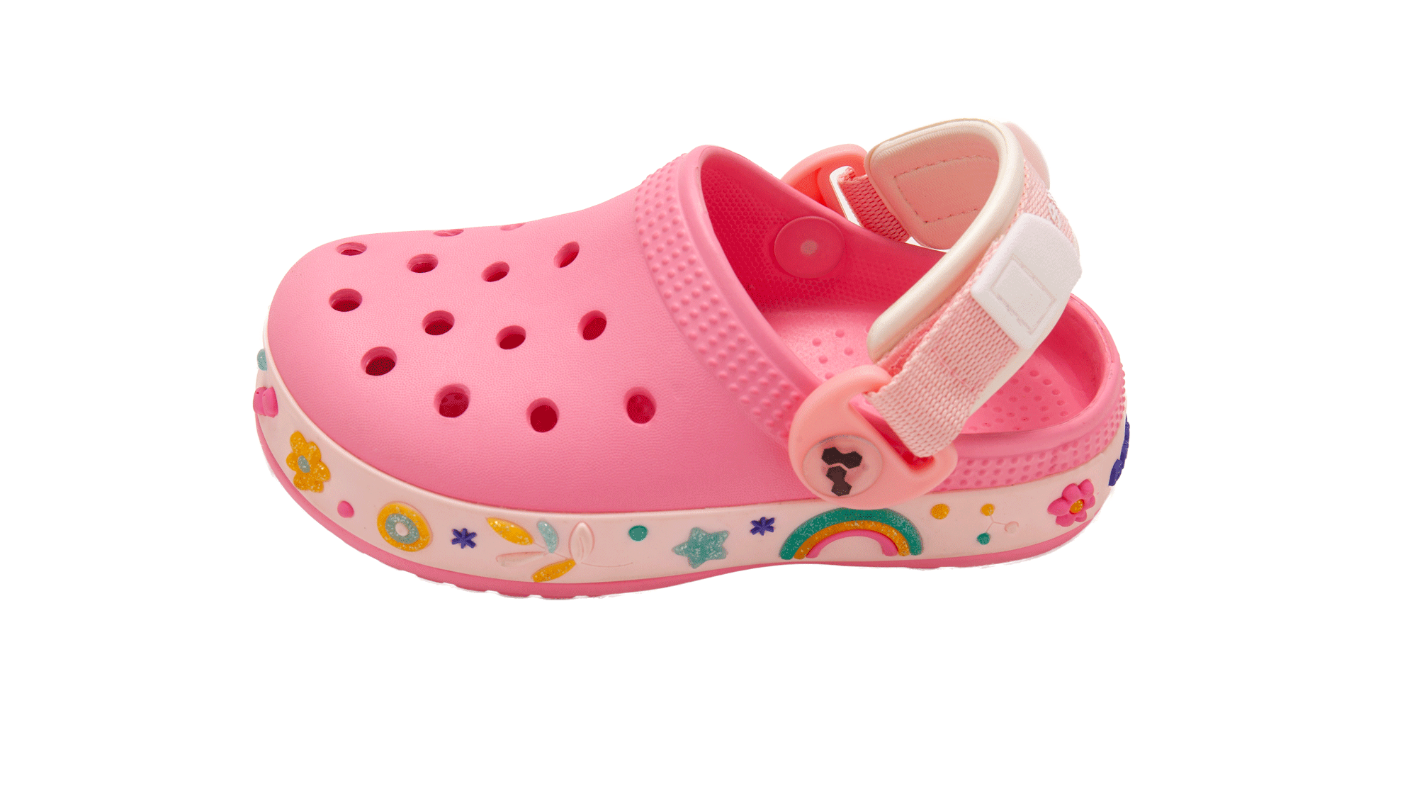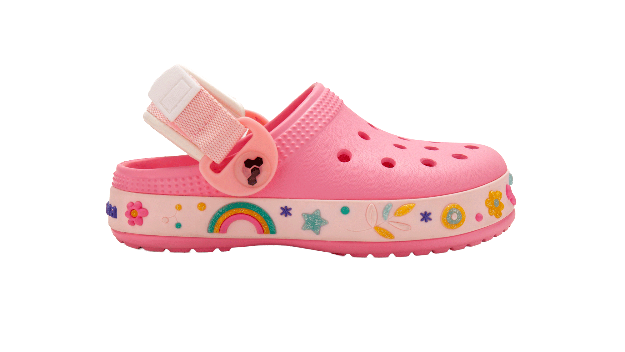 Fabricado en goma EVA, es liviano, flexible y fácil de limpiar, perfecto para acompañar todas sus actividades diarias. Además, cuenta con tira trasera regulable que asegura un ajuste firme y mayor seguridad al caminar o jugar.